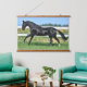 This product features a side view of a black akhal teke stallion galloping along paddock fence. The Akhal Teke is a Turkmen horse breed. They have a distinctive metallic sheen and a reputation for speed and endurance as well as intelligence.