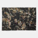 A pattern of dull gold dormant branches against a black background with flecks of festive glitter-like confetti.