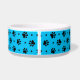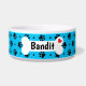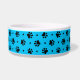 Black dog paw prints and hearts pattern with a custom bright blue background colour on dog food and water bowls. This pattern can be easily enlarged or reduced to your preference and pick your favourite background colour. Personalize this dish with your dog's name printed on the white dog bone accented with a red heart. Cute gift idea for any dog parent!