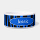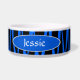 Give your pet a modern edge with this cool black and blue zebra striped food dish! Pet dish features a black and blue zebra stripe pattern all around with a blue oval area with white trim on each side. Inside each oval is text in white font to be customized with your pets name.