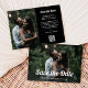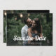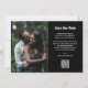 These trendy and vintage style wedding save the date cards feature retro white script on the front as an overlay on your photo. The back has a dark black background and white text, and another photo, along with a scannable QR code to add your wedding website.