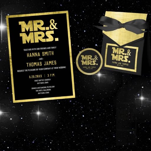 Introducing our exclusive Black and Brushed Gold Mr. and Mrs. Wedding Classic Round Sticker, designed with a captivating science fiction theme. Perfect for adding a touch of futuristic elegance to your wedding decor, these stickers feature a sleek black background accentuated by luxurious brushed gold accents. The bold "Mr. and Mrs." text stands out in a modern, galactic-inspired font, making these stickers a stylish and memorable addition to your special day. Ideal for sealing envelopes, decorating favour boxes, or personalizing wedding invitations, these versatile stickers are a must-have for any couple looking to blend timeless romance with a dash of sci-fi charm. Make your wedding truly out of this world with our Black and Brushed Gold Mr. and Mrs. Classic Round Stickers.