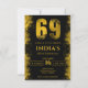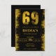 This Black And Gold 69th Birthday Party invitation features a brushstroke faux gold foil number 69, It is stylish and elegant, bold and stylish golden text announces the occasion, a great surprise for a milestone birthday celebration.