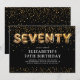 Modern 70th birthday invitation featuring a stylish black background, a scattering of gold glitter confetti, gold hellium balloons that spell "seventy", and a elegant party text template that is easy to personalize.