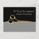 A modern black and gold beauty and hair salon appointment reminder postcard with a trendy black and white chevron pattern and a pair of gold hairstylist scissors. Personalize by adding the name of beautician and appointment information. Flat printed image, not metallic.
