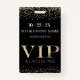 This custom VIP party pass features a black background with a gold glitter confetti along the top and bottom. The title "VIP" is printed in large gold text, with the date and name of the event printed above, and "all access pass" printed below. The back of the badge features a space to add your own custom text or addition event information. It's perfect for parties, fundraisers, a concert, or other special event.