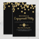 A black and gold glitter engagement party invitation featuring gold dots.