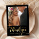Modern Whimsical Boho Chic Huge Gold Calligraphy Script 2 Photo Wedding Thank You Card. Stylish wedding thank you template featuring a full vertical photo on the front with the text "Thank You" in a whimsical swirly hand lettering typography swash tail font script faux gold foil on black background. At the reverse side pre-made thank you message and one photo. Easily to personalize your name and thank you message. If you prefer to handwrite your note, just delete the sample text to make more space. If You need help or matching item, please contact to me!