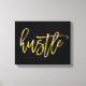 Typography gold foil Hustle wrapped canvas printed on black background. Dimensions of the wrapped canvas are 14 inches by 11 inches. You can get smaller (8 inches by 10 inches) or larger (40 inches by 60 inches) canvas too or any other custom dimensions.