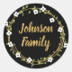 Christmas holiday stickers with our a pretty laurel wreath of gold, white, and green on a black background. You can easily customize these name stickers with your last name before ordering with fancy gold cursive text!