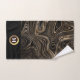 A black and gold modern bath towel set with an abstract swirl pattern ready for you to personalize. These towels are both chic and stylish to help complement your existing decor.