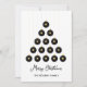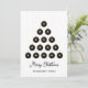 This modern simple Christmas card features 15 black and gold record disk hanging baubles on a white background with gold string. Edit your Christmas message and family name.