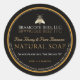 Location and product volume is written in the lower part of label under the words "NATURAL SOAP" which takes centre field in a chiseled gold metallic font. Product description is written in a decorative script font above the product name.