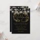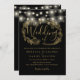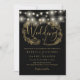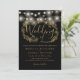 A black and gold wedding invitation featuring pretty string lights and a delicate hand-drawn rustic floral garland of botanical leaf foliage with stylish script typography. Personalize with your special wedding day information. Designed by Thisisnotme©