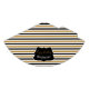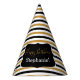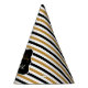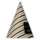 Black and gold striped pattern with white birthday party hat. The design features a black and white stripes pattern, a black circle with a white border and your custom text in gold and white.