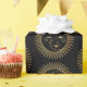 Celestial themed wrapping pater features gold illustration of combined sun and moon faces on black background