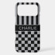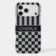 Customize this iPhone 17 pro max case with black and gray stripes on the top half and black and gray checkered pattern on the bottom half with your name in a modern CAP font in the middle in gray on black. It's preppy, trendy and bold - definitely cool!