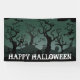 Black and grey graveyard Halloween banner. It showcases a cemetery with spooky trees, graves, crosses, skulls, a witch, an owl, bats, a black cat, clouds and the text "Happy Halloween" on black and grey background.