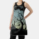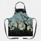 Black and grey haunted graveyard Halloween apron. This all-over print apron displays a haunted cemetery in black and grey with gravestones, spooky trees, a witch, an owl and bats.