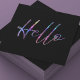 An elegant business card featuring the word "Hello" on the front in holographic glitter with space on the back for your name and contact information. This design includes a QR code on the back.