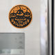 Bold and festive, this black and orange Halloween magnet features grinning jack-o’-lanterns, bats, and a “Happy Halloween” message in spooky lettering.