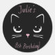 Perfect for your kitty cat themed birthday party - cute kitten face with large eyes on dark black sticker can easily customize with personal message or birthday child's name.