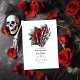 Whimsical vintage floral gothic skeleton hand wedding invitation in accents of red and gold customizable to your event specifics. Ideal for any given theme or garden wedding. The QR code on the reverse directs to your wedding site where people can learn more and rsvp.