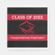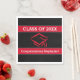 Simple yet stunning graduation design features a red mortarboard graduation cap in the centre. Above and below the graduation cap are thick red lines with white trim. Inside the top line is customizable text that says Class Of 20XX where you can add the correct graduation class year. Inside the lower line is customizable text in white font there you can add the graduates name, etc. Matching invitations and favours also available!