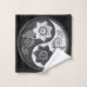 A yin yang symbol features intricate floral patterns on each side, one half in silver and the other in black. Delicate leaves and swirls add to the symmetrical elegance.