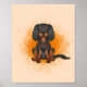 Destei's original cartoon illustration of a cute black and tan colour Cavalier King Charles Spaniel breed dog who is sitting. There is a splash of orange colour behind the dog.