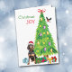 On the front of this Christmas card, a Black and Tan Coonhound wears a Santa hat while he sits beside a Holiday tree. Brightly wrapped gift packages are scattered about, and a bullfinch is landing on the Christmas tree. The red and green text says "Christmas JOY". Inside is stylized text that says MERRY CHRISTMAS, and a text field for you to customize.