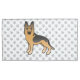 Destei's original cartoon illustration of a black and tan coat colour German Shepherd breed dog. The background has a pattern of grey dog paw prints.