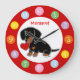 Unique and funny Dog Art painted by Naomi Ochiai from Japan. Cute and Funny Dachshund cartoon gift items for Dachshund fans!! An adorable Black and Tan Smooth Haired Doxie puppy is feeling happy with a tiny heart in his/her mouth. You can customize text and more! Good for kid's room, too.