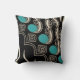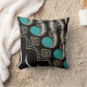 Throw pillow with image of black and turquoise batik design on the front and a black patterned design on the back against a turquoise background.