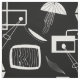 Mid-century modern fabric, black and white abstract pattern with quirky shapes and lines. White pattern on a black background.