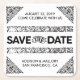 A black and white wedding save the date coaster with a vintage antique lace look. Text across the centre of the coaster reads "save the date" and all remaining text can be personalized.
