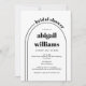 Elegant and classic black and white wedding bridal shower invitation featuring an arch design and eye-catching bold typography. The arch beautifully frames the text, creating a sophisticated and timeless look. The words 'bridal shower' are elegantly curved at the top, following the graceful curve of the arch and extending to the right for a visually appealing touch. The bride's name is prominently displayed in a bold font, adding a modern and stylish element to the invitation. To add a personal touch, a lovely photo of the couple is featured on the back of the invitation, making it a truly special keepsake for guests.