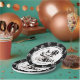 A cute axolotl and birthday balloons themed personalized birthday party paper plates with black and white balloons with polka dots and an axolotl with birthday gifts and balloons.