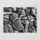 Black and white seashell photography postcard. This picture of seashells includes a sundial, lightning whelk, sea urchin, worm shell and bits of shells which provides interesting shapes and textures. Blank on the back to use for any occasion.