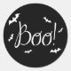 A black and white Halloween Boo! sticker featuring quirky typography with bats. This sticker is perfect for Halloween party favours.