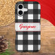Add timeless style to your phone with this black and white buffalo check case. The bold checkered pattern brings a classic yet modern farmhouse look. Personalize with a name in elegant red script in a retro style.