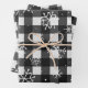 A trio of black and white buffalo plaid and snowflakes gift wrapping paper sheets.