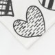 Playful cat tugging at a heart shaped balloon surrounded by different patterned hearts in black and white.
