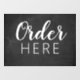 This custom business black chalkboard food truck sign is able to hold your custom message. Personalize to edit this custom Order Here sign features a faux black chalkoard sign with white handwritten script and modern font.