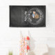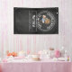 A cheers and beers 40th birthday party theme banner with white text on black chalkboard background. A happy cartoon guy is drinking beer straight from the birthday barrel with candles. The text can be customized to fit other birthday parties like 50th or 60th birthdays.