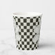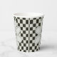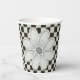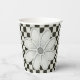 The clean, bold lines of this paper cup designed by digital artist, Leslie Sigal Javorek, is a perfect choice for modern and neutral urban sophisticated events. Featured is a large central white & grey daisy (painted in a manner to suggest diamonds) that intersects a black & white marbled chequerboard all centred and set against a solid black field.