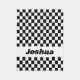 Cool custom fleece blanket has a black and white chequered flag design on the front. Personalize it by changing the name to whatever you like. This would make a great gift for the race car enthusiast in your life. Please see our other custom chequered flag items.