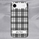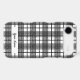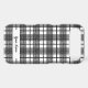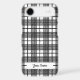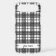 A unique editable phone case with retro script letters on a background of a black and white glen inspired plaid pattern.