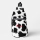 Black and white cow spots crossbody sling bag. Fun travel bag for work or sports. Cool present for him or her. Personalize with custom text.