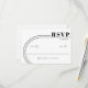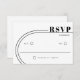 This wedding RSVP card exudes elegance with its black and white colour scheme and horizontal arched frame. The minimalist design showcases a contemporary typography and a unique arched layout. The card's standout feature is a gracefully curved line that starts from the bottom and gracefully runs along the left side, before seamlessly turning towards the right where it meets the word 'RSVP'. This sophisticated design is perfect for couples seeking a modern and stylish invitation for their special day.